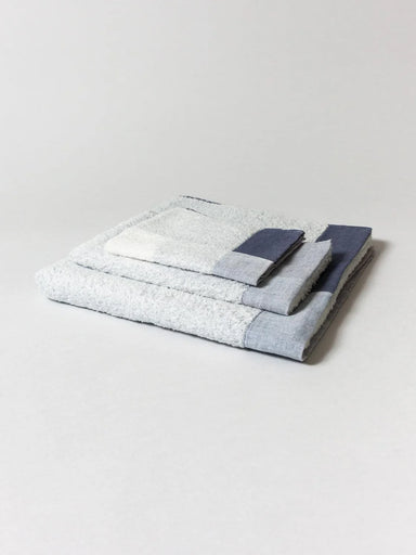 This Japanese towel has a pleasing color block style in soft neutral tones with a tightly woven chambray front and terry pile backing. Constructed ...