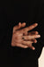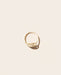 An openwork ring crafted in seemingly timeworn gold, its design revealing a diamond-studded moon beside a sun etched with serrated rays.